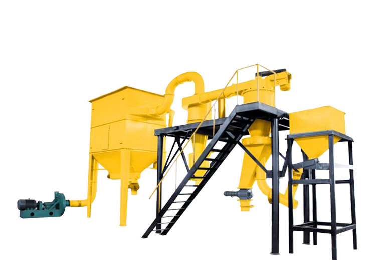 整套分級裝置由氣流分級機、旋風(fēng)收集器、脈沖除塵器、高壓引風(fēng)機、電控柜等組成。氣流分級機是帶有二次進(jìn)風(fēng)及立式安裝的大葉輪轉(zhuǎn)子的強制型分級機。